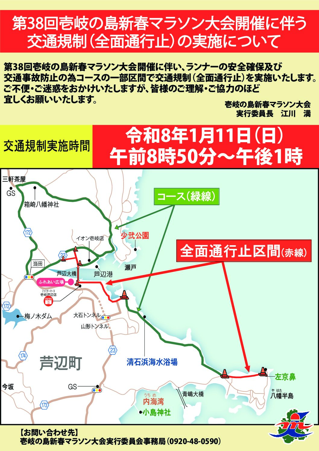 第38回壱岐の島新春マラソン大会開催に伴い、ランナーの安全確保及び交通事故防止の為一部区間で交通規制(全面通行止)を実施いたします。
